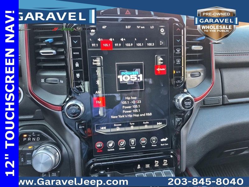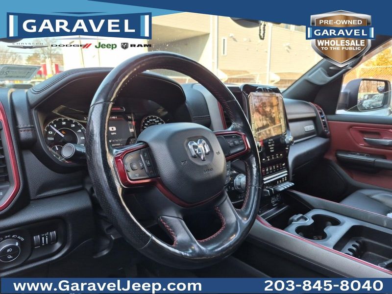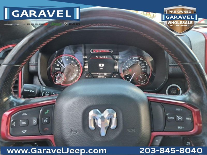 2019 Ram 1500 Rebel Diamond Black Crystal Pearlcoat HEMI 5.7L V8, 4WD, Red/Black Low Back Bucket Seats, ***CARFAX No Accidents Reported!***, ***Panoramic Sunroof / Moonroof***, ***Apple CarPlay/Android Auto!***, ***9 Amplified Speakers w/Subwoofer***, 12'' Touchscreen Display, 3.92 Rear Axle Ratio, Auto-Dimming Rear-View Mirror, Heated Front Seats, Heated Steering Wheel, ParkSense Front/Rear Park Assist w/Stop, ParkView Rear Back-Up Camera, Power Adjustable Pedals, Power-Folding Mirrors, Rebel Level 2 Equipment Group, Remote Start System, Steering wheel mounted audio controls, Trailer Brake Control.