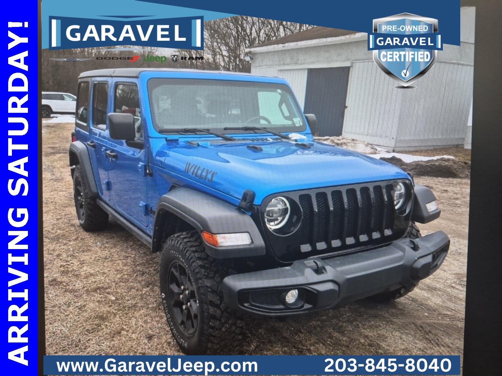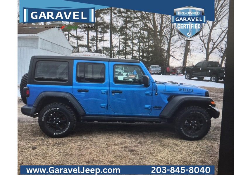 2021 Jeep Wrangler Unlimited Willys Hydro Blue Pearl Coat Garavel Certified, 4WD, Black w/Cloth Low-Back Bucket Seats, ***CARFAX One Owner and No Accidents Reported!***, ***Apple CarPlay/Android Auto!***, ***Cold Weather Group***, ***Moab Black Aluminum Wheels***, 7.0'' Touchscreen Display, Anti-Spin Differential Rear Axle, Apple CarPlay, Convenience Group, Front Fog lights, Front LED Fog Lamps, Heated Front Seats, Heated Steering Wheel, LED Headlamp & Fog Lamp Group, LED Premium Reflector Headlamps, Rear Window Defroster, Steering wheel mounted audio controls, Technology Group.