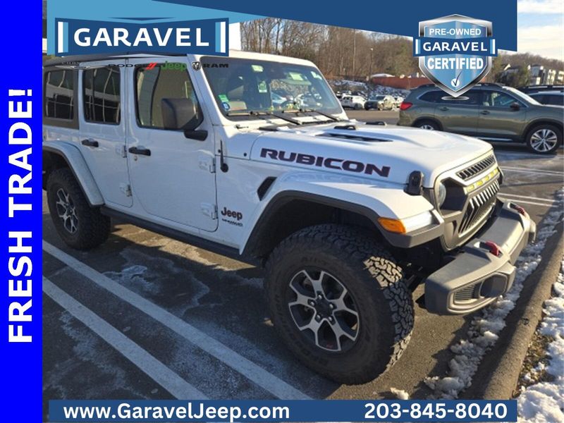 2021 Jeep Wrangler Unlimited Rubicon Bright White Clearcoat Garavel Certified, 3.6L V6 24V VVT, Black w/Leather Trimmed Bucket Seats, ***CARFAX One Owner!***, ***Apple CarPlay/Android Auto!***, ***Navigation / Nav / GPS System***, ***Advanced Safety Group***, ***Cold Weather Group***, 4.10 Rear Axle Ratio, 8.4'' Radio & Premium Audio Group, 8.4'' Touchscreen Display, Alpine Premium Audio System, Auto High Beam Headlamp Control, Automatic temperature control, Blind Spot & Cross Path Detection, Front LED Fog Lamps, Full Speed Forward Collision Warning Plus, GPS Navigation, Heated Front Seats, Heated Steering Wheel, LED Lighting Group, LED Premium Reflector Headlamps, LED Taillamps, Off-Road Info Pages, ParkSense Rear Park Assist System, ParkView Rear Back-Up Camera, Performance Suspension, Safety Group, Steering wheel mounted audio controls.